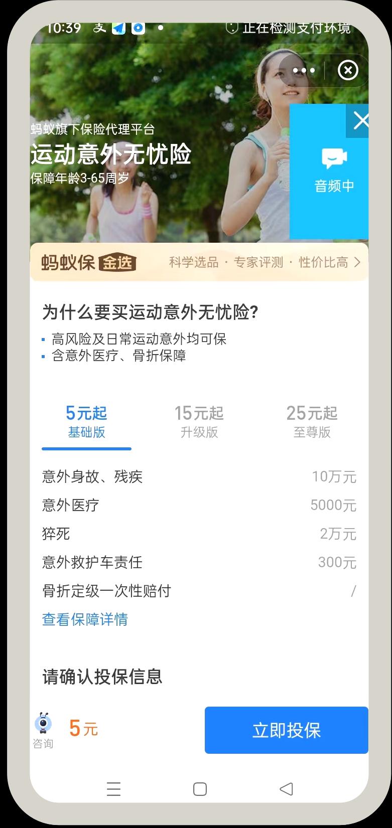 说明:购买运动意外伤害险步骤:1、打开支付宝,输入“运动意外伤害险”2、进行购买。