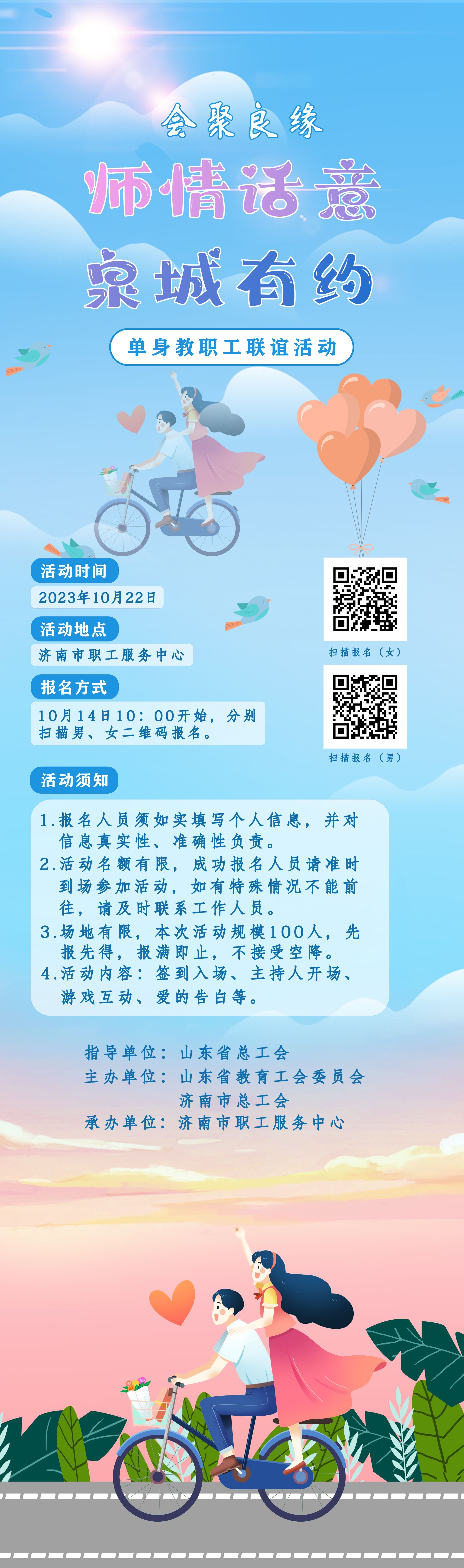 接省教育工会委员会通知,为给单位优秀单身青年搭建情感交流平台,定于10月22日下午在济南市职工服务中心举办联谊活动,10月14日10:00开始扫码报名,详见附件通知。