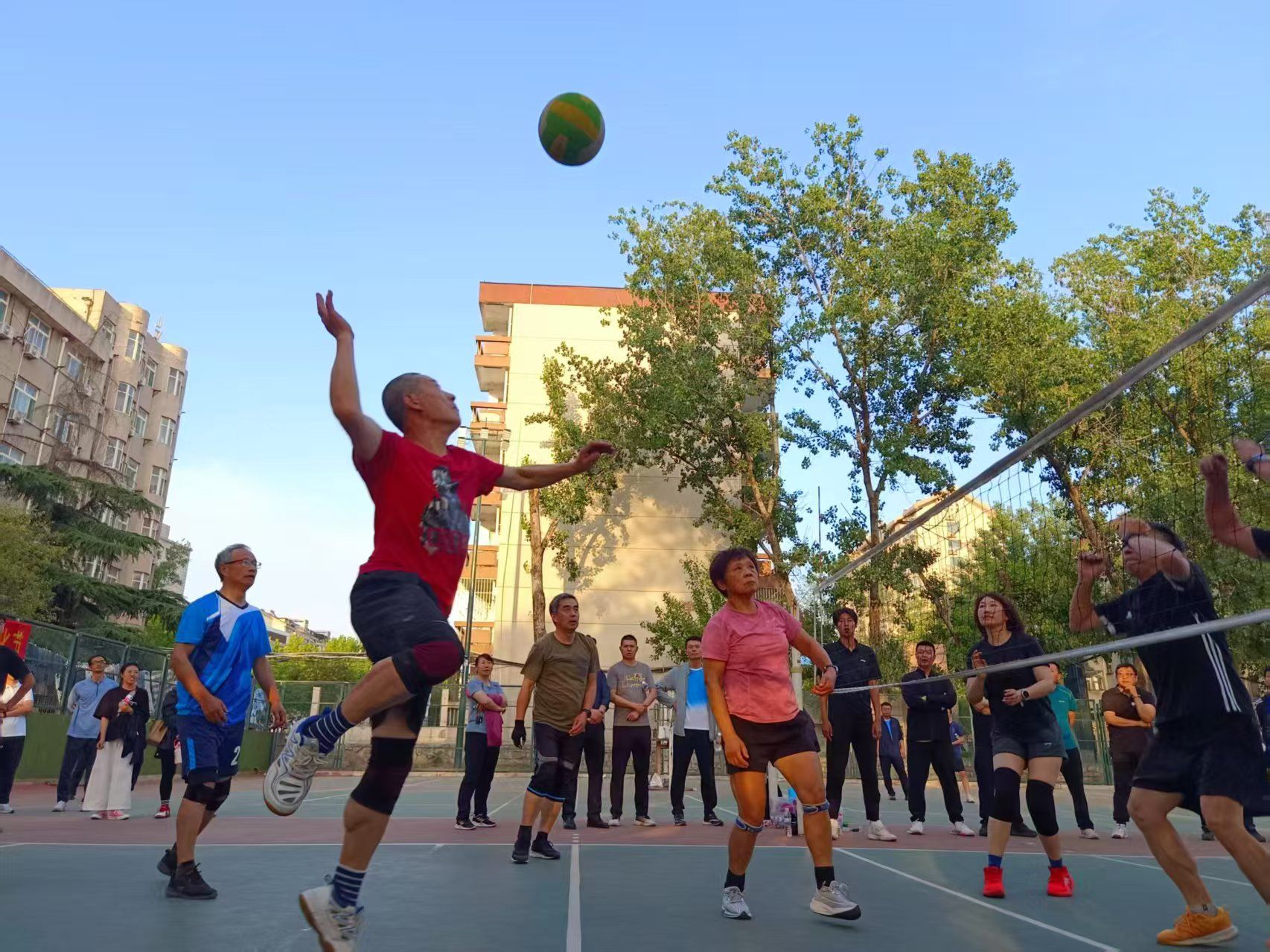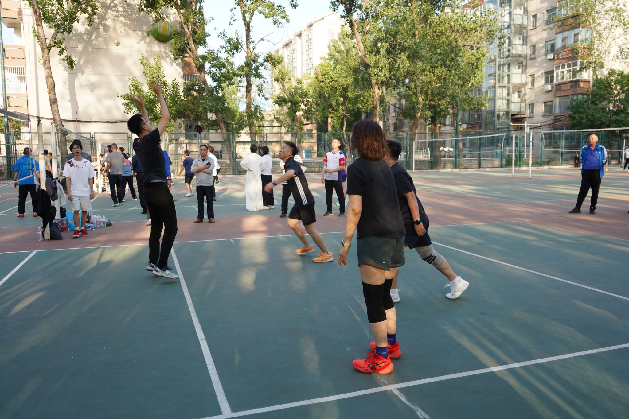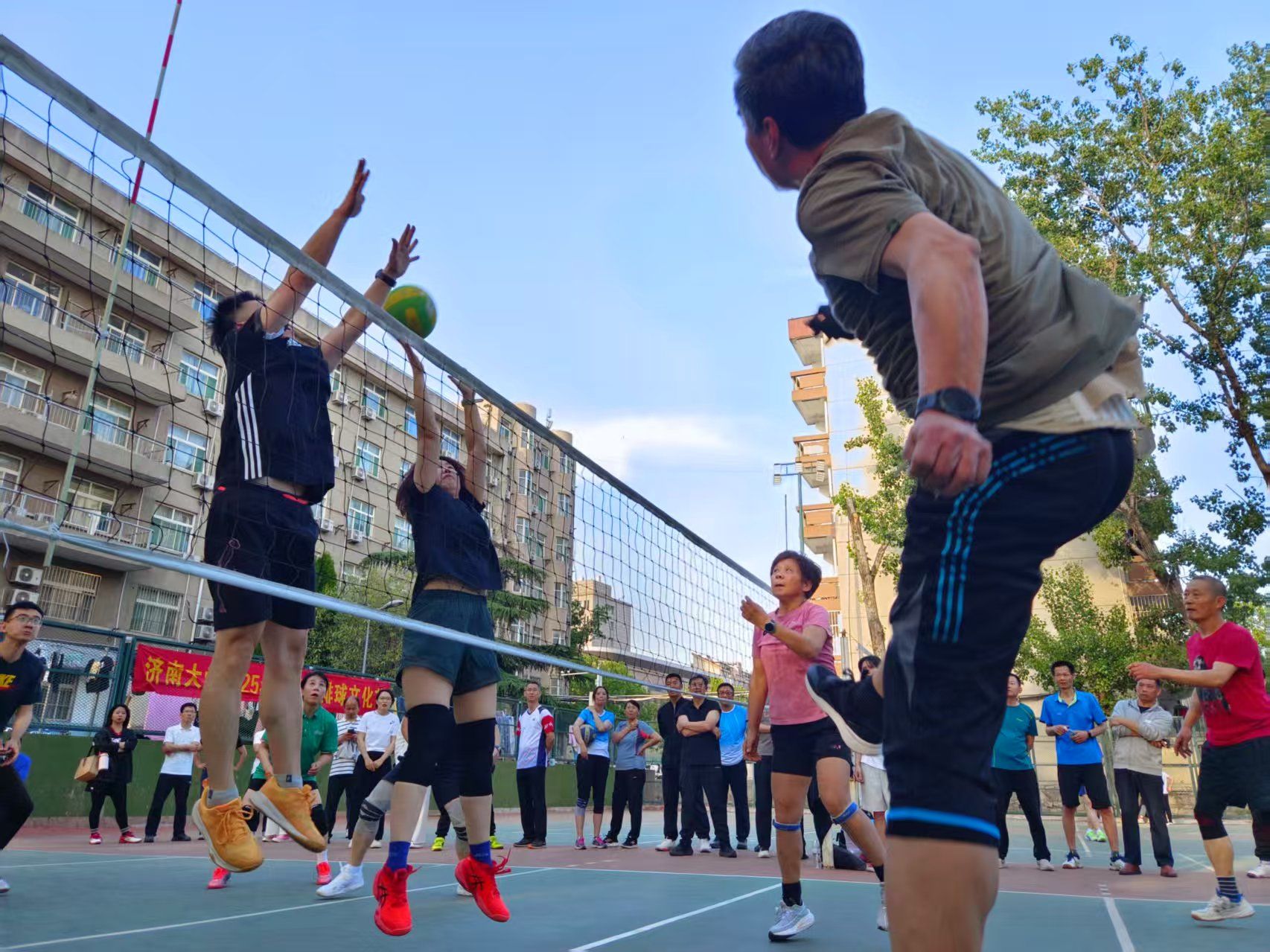 比赛以各基层工会为单位组队,设置混合组和女子组比赛,共有16支队伍100余人参与比赛,赛事分小组单循环和交叉赛两个阶段。赛程经过科学编排,在保证公平竞争的同时,极大地提升了比赛的观赏性。赛场上,队员们发球、拦网、扣杀动作娴熟,精彩瞬间不断,现场气氛热烈。参赛教师们以流畅的攻防轮转和永不言弃的救球姿态,将知识分子的睿智与运动员的激情完美交融。经过52场精彩比赛,离退休处、机关1队、水环学院、政法学院依次获得女子组前四名;机关1队、离退休处、机关2队、外语学院、商学院、图书馆、水环学院、物理学院依次获得混合组前八名。