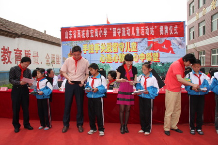 仪式上,与会领导为活动站揭牌;中建八局第二建设有限公司向省儿基会捐赠10万元,省妇联副主席任月英接受捐赠并向其颁发捐赠证书;蔡玉水艺术创作中心及山东大学等高校组成的志愿者与留守流动儿童结成帮扶对子;留守流动儿童代表发言。