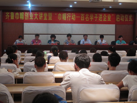 7月9日,省妇联、山东建筑大学联合主办的“激励女大学生创业就业共促社会和谐发展”齐鲁巾帼创业大讲堂暨“巾帼行动—百名学子进企业”活动启动仪式在山东建筑大学报告厅举行。省妇联副主席郭翠芬、山东建筑大学党委副书记张书明出席活动,并向山东建筑大学管理工程学院社会实践队授旗。齐鲁巾帼创业导师、山东金马大酒店董事长王新敏及省巾帼创业示范基地负责人,山东禹王管业有限公司董事长张金凤、山东安泰建筑筑路工程有限公司副总经理李明田应邀参加报告会,并与现场女大学生展开互动交流。200余名女大学生参加了报告会。