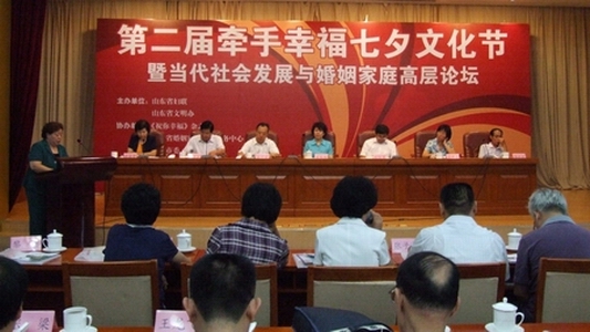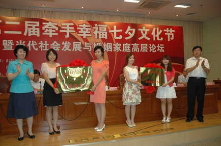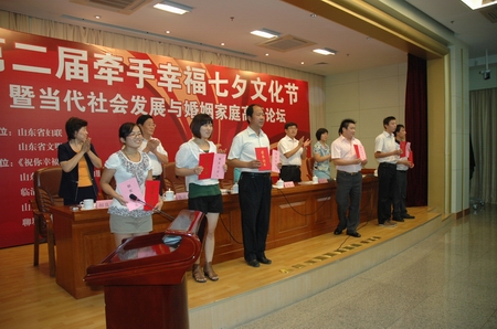 8月16日,由省妇联、省文明办联合举办的牵手幸福七夕文化节在济南举行。省妇联主席翟黎明、省文明办副主任王红勇、省民政厅副厅长秦守政、省妇联副主席范晓丽、临清市委书记张旋宇、省期刊协会副会长杨洪柱等领导出席活动并为“全国爱情婚姻家庭漫画大赛”获奖作者颁奖,向五好文明家庭代表赠送了《全国爱情婚姻家庭漫画大赛优秀作品集》。翟黎明、王红勇为山东省婚姻家庭服务中心新建工作站揭牌,王红勇为文化节致辞。文化节期间,同时举办了纪念我国《婚姻法》颁布实施60周年大会暨当代社会发展与婚姻家庭高层论坛,有关专家学者就妇女维权与和谐社会建设,法律视野中的爱情、婚姻与家庭等做专题发言。