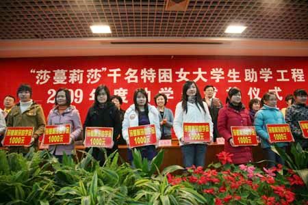 此项助学工程在2008年“三八”节期间启动,计划用5年时间为千名女大学生提供100万元助学金。在去年资助150名大学生的基础上,今年进一步扩大受助范围,在10所高校为200名女大学生每人提供1000元助学金。